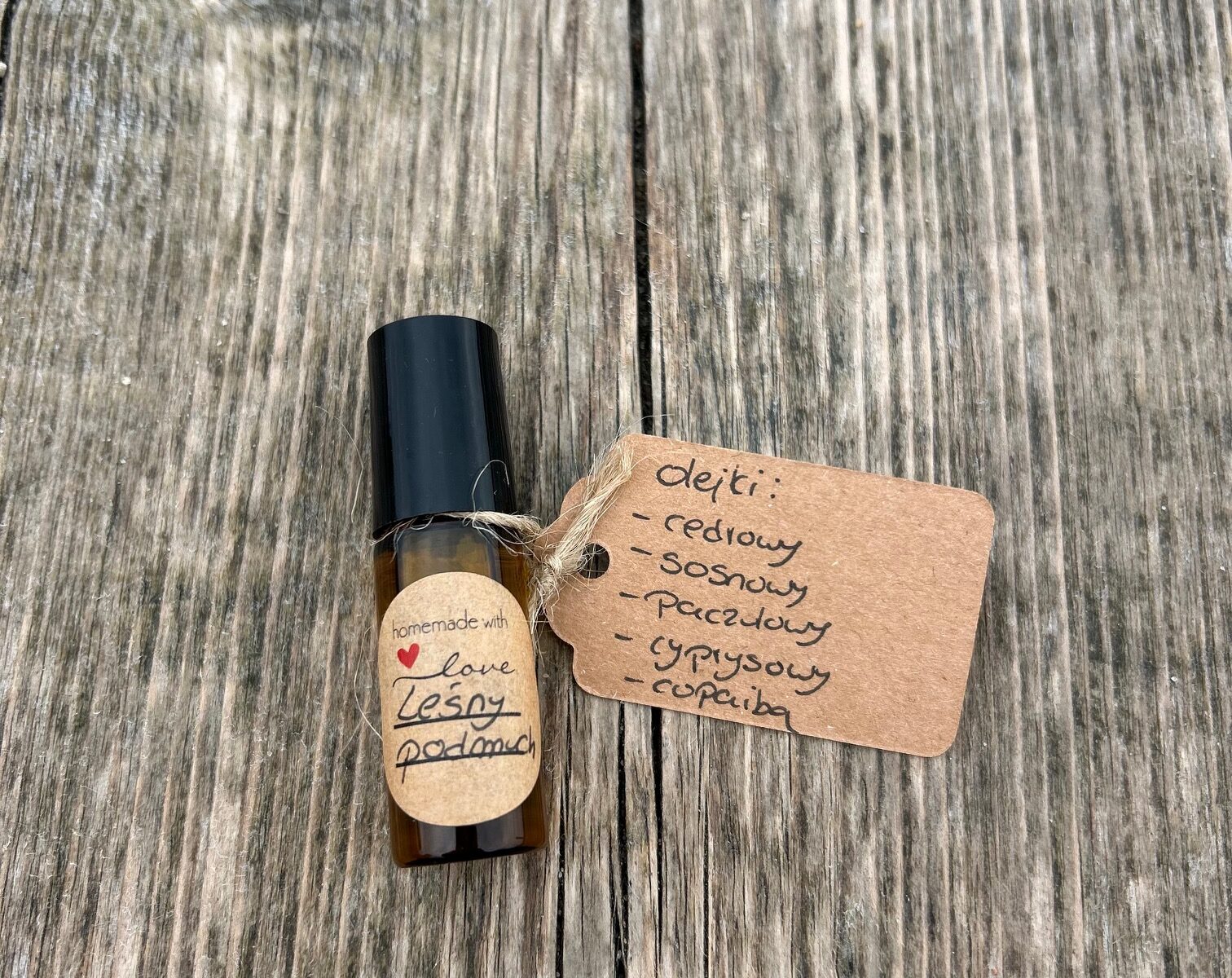 Mieszanka „Leśny podmuch” składająca się z olejków: cedr, paczula, sosna, cyprys, copaiba. Ręcznie robione.