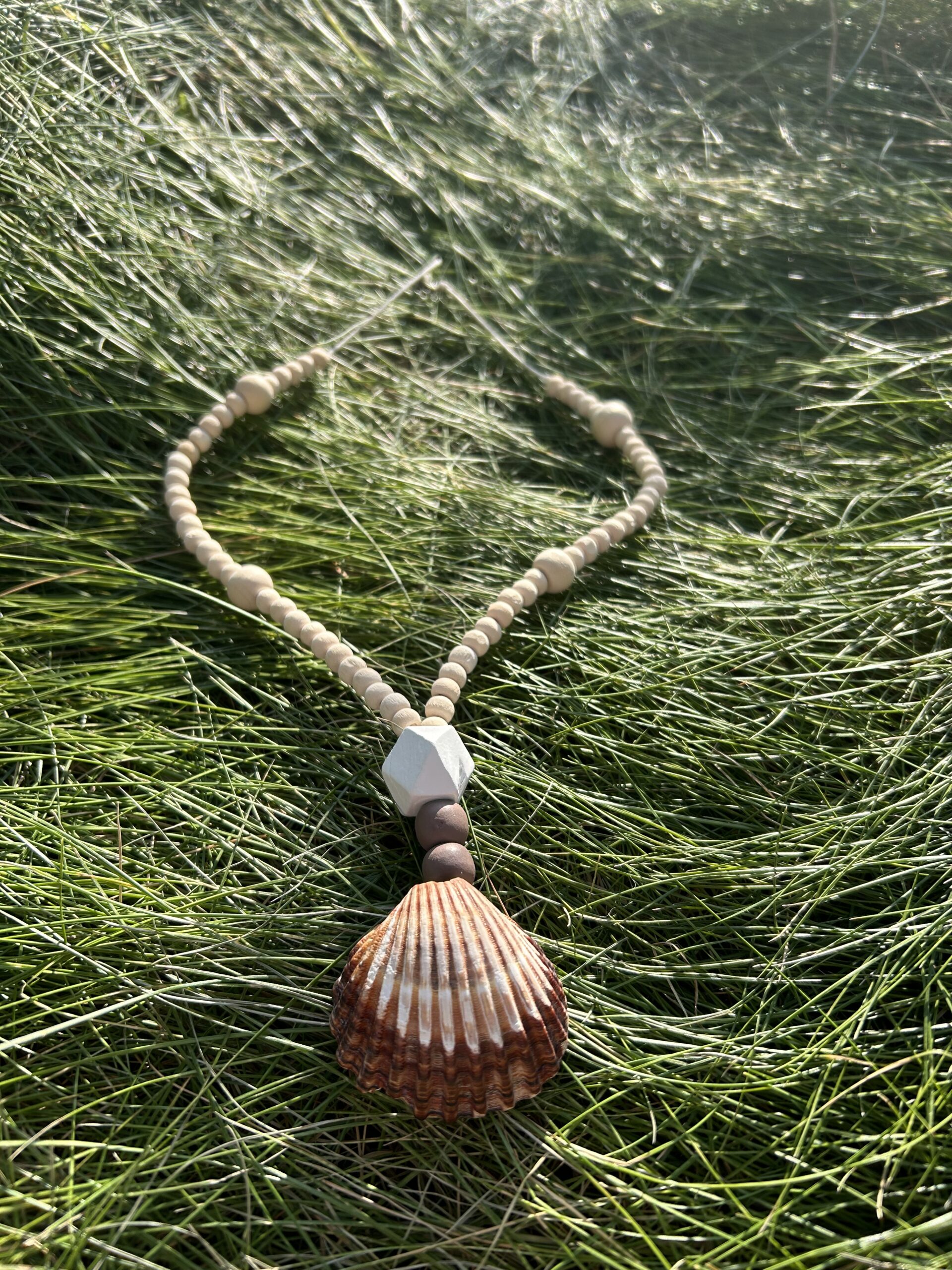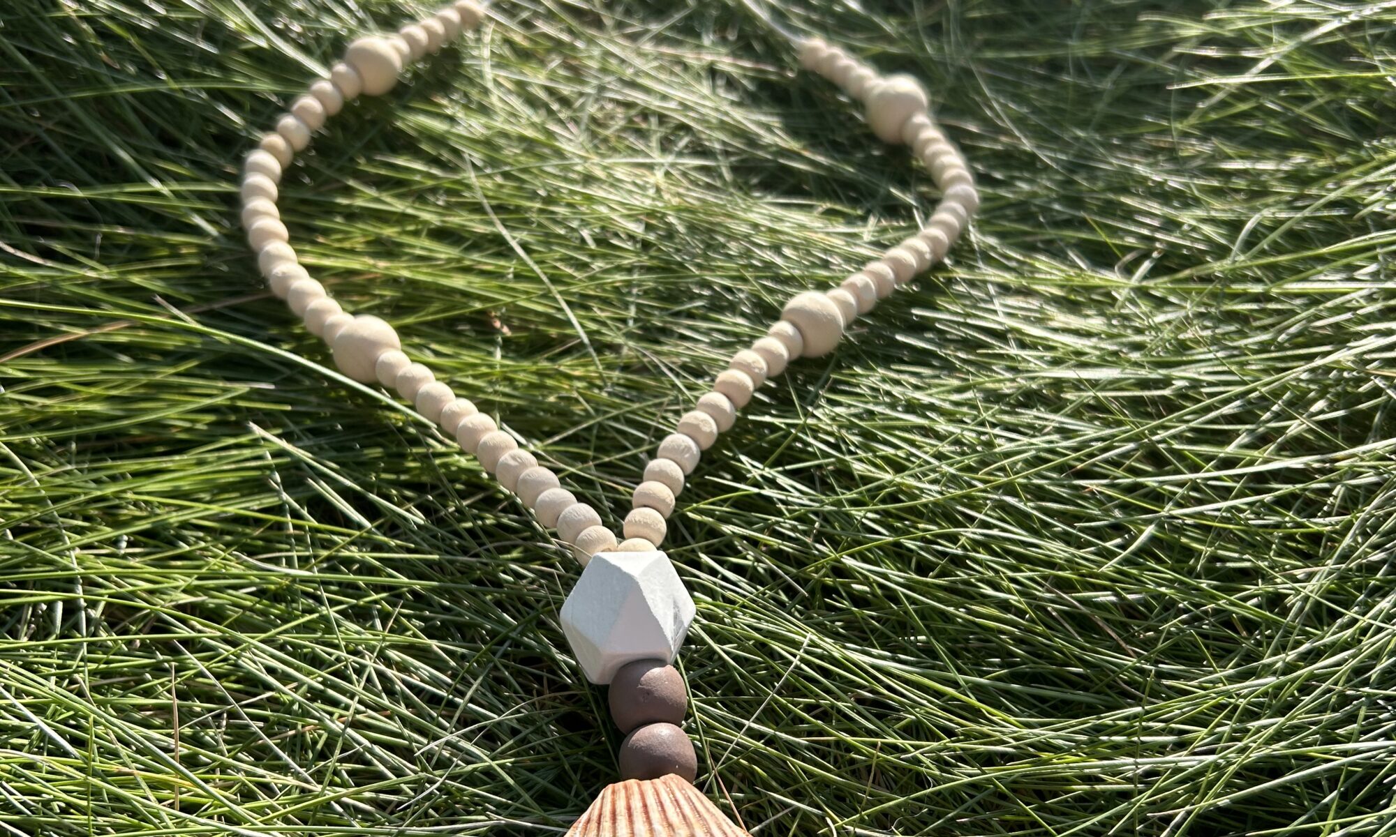 Ręcznie wykonany naszyjnik, który łączy w sobie siłę natury i delikatność rękodzieła. Naturalne muszle, które niegdyś szumiały w rytmie fal, połączone zostały z ciepłem drewnianych akcentów, tworząc harmonijną kompozycję.