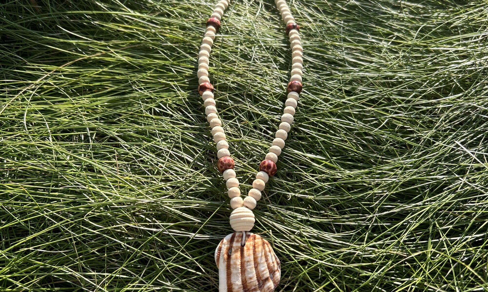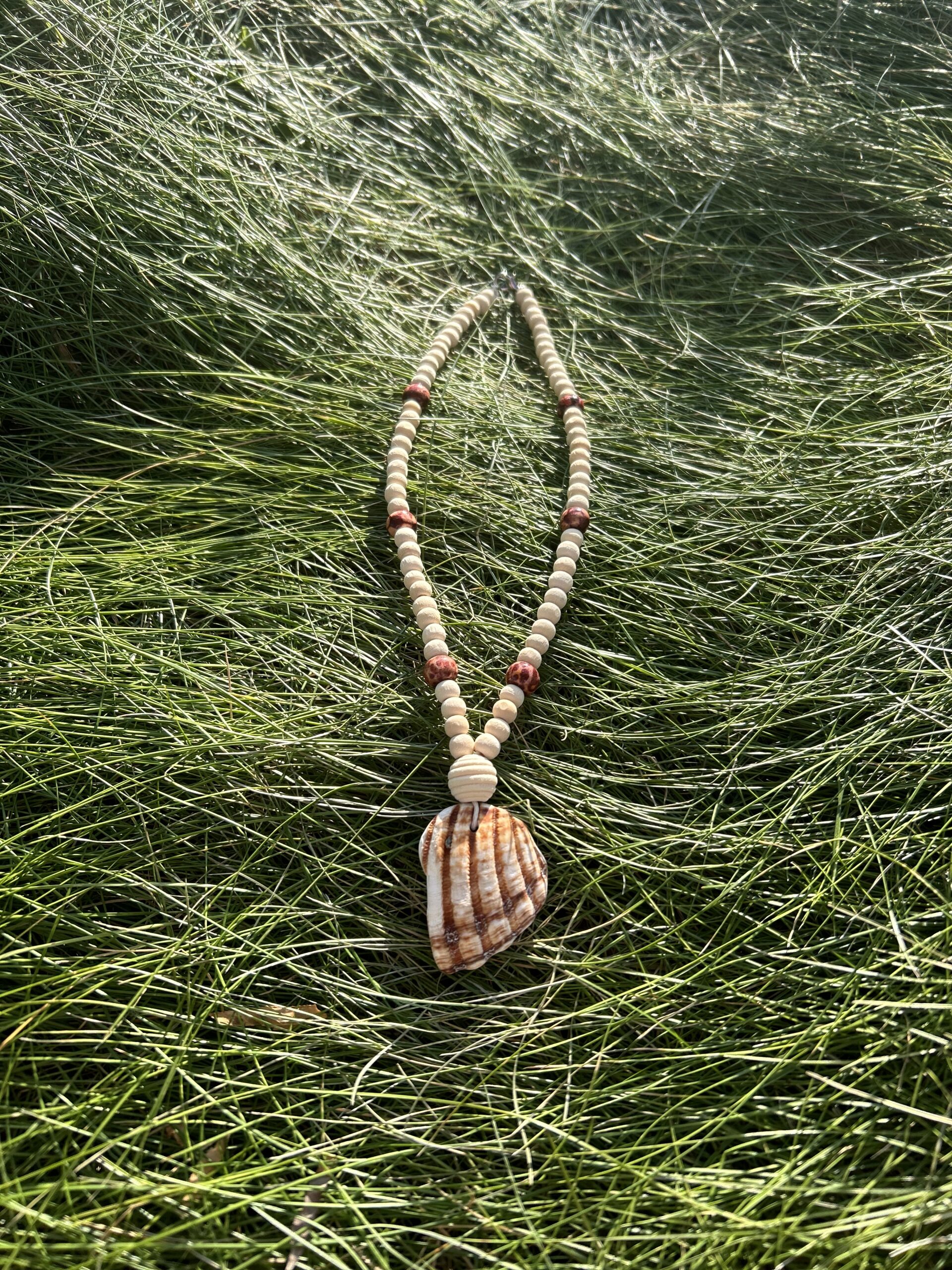 Ręcznie wykonany naszyjnik, który łączy w sobie siłę natury i delikatność rękodzieła. Naturalne muszle, które niegdyś szumiały w rytmie fal, połączone zostały z ciepłem drewnianych akcentów, tworząc harmonijną kompozycję.