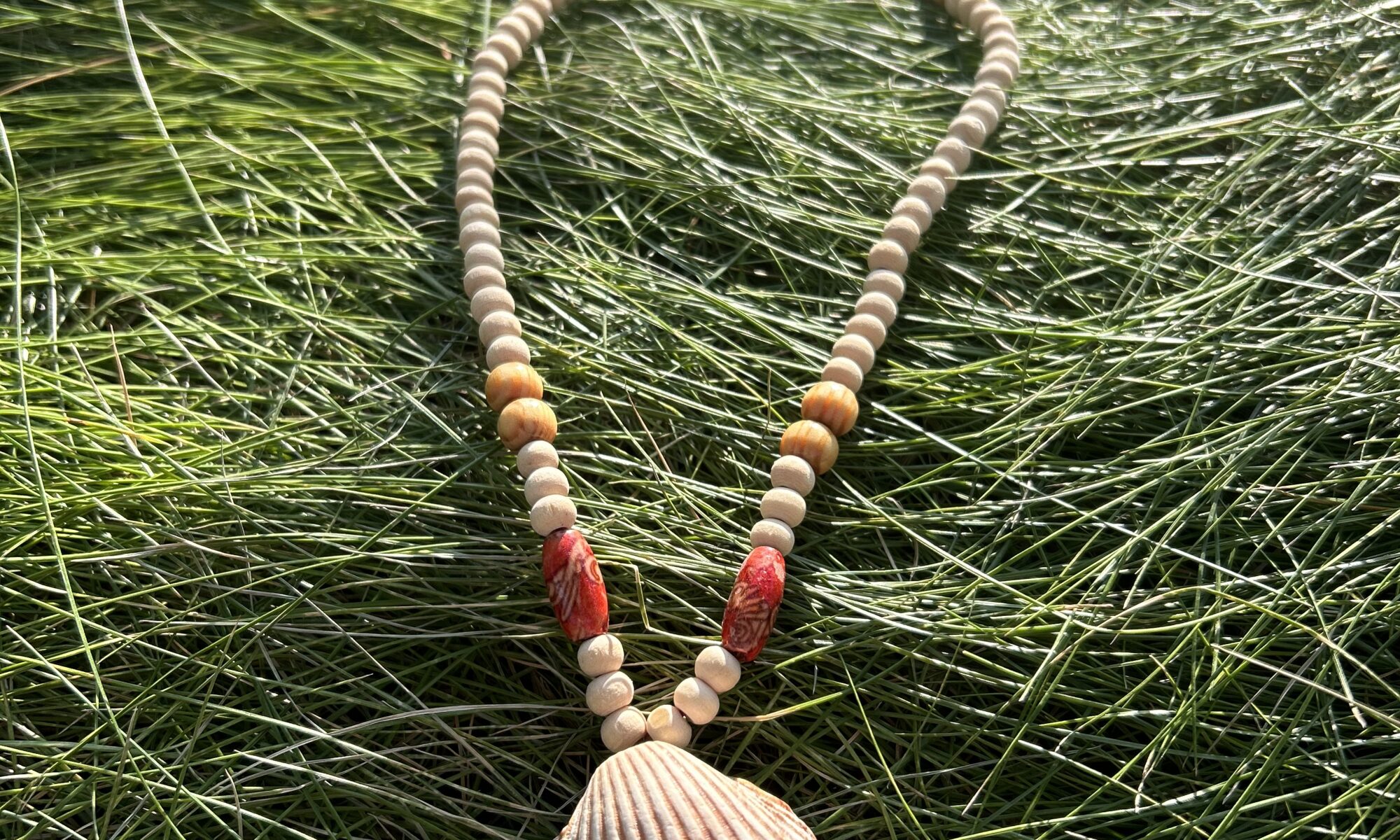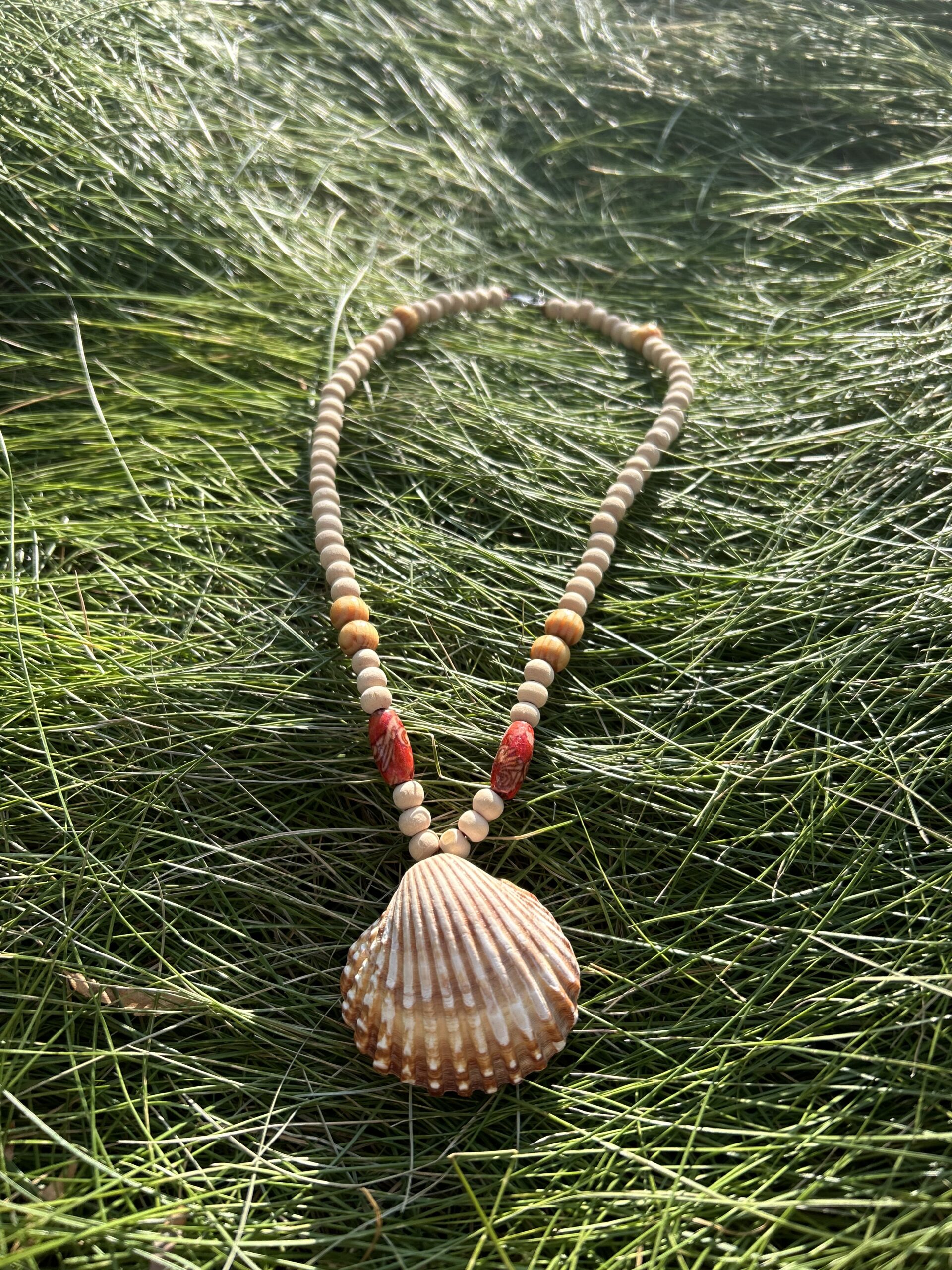 Ręcznie wykonany naszyjnik, który łączy w sobie siłę natury i delikatność rękodzieła. Naturalne muszle, które niegdyś szumiały w rytmie fal, połączone zostały z ciepłem drewnianych akcentów, tworząc harmonijną kompozycję.