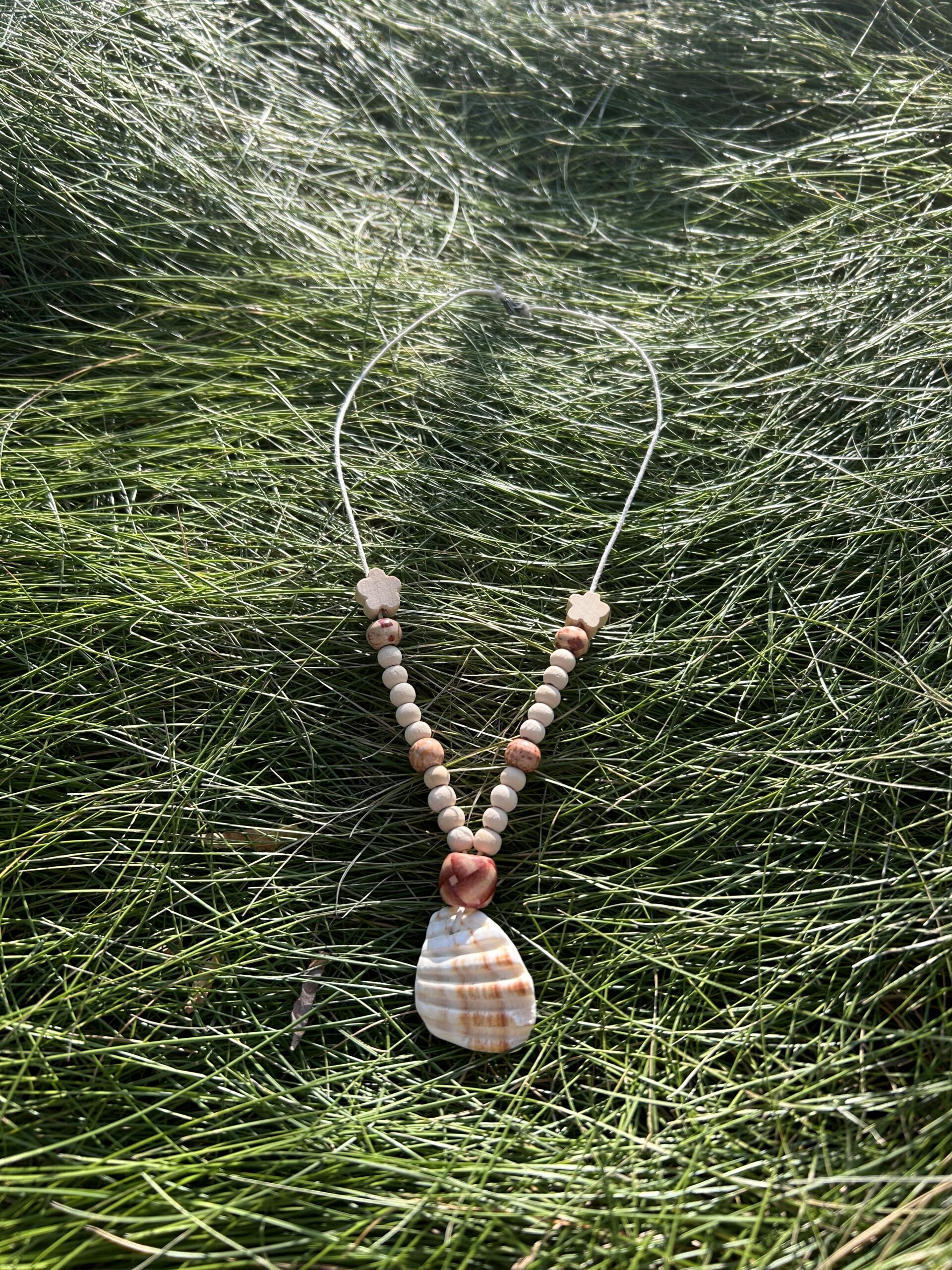 Ręcznie wykonany naszyjnik, który łączy w sobie siłę natury i delikatność rękodzieła. Naturalne muszle, które niegdyś szumiały w rytmie fal, połączone zostały z ciepłem drewnianych akcentów, tworząc harmonijną kompozycję.